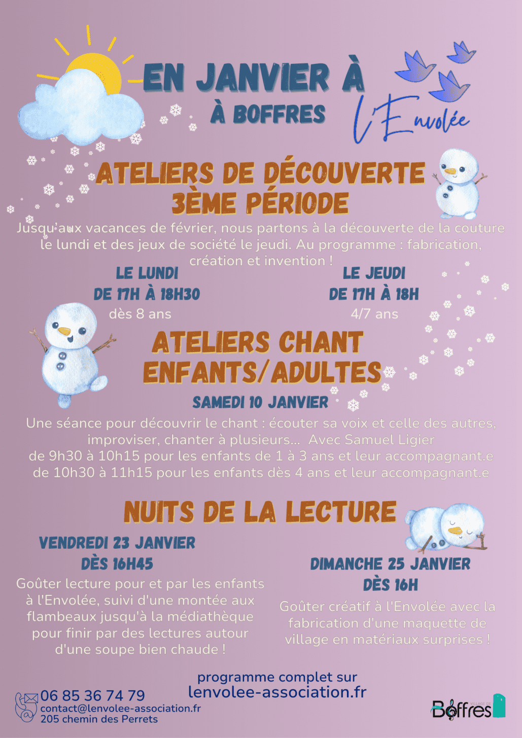 - vendredi 23 janvier de 16h45 à 20h : goûter lecture à l’Envolée avec des enfants de l’école de Boffres, suivi d’une montée aux flambeaux jusqu’à la médiathèque pour finir par des lectures autour d’une soupe bien chaude !