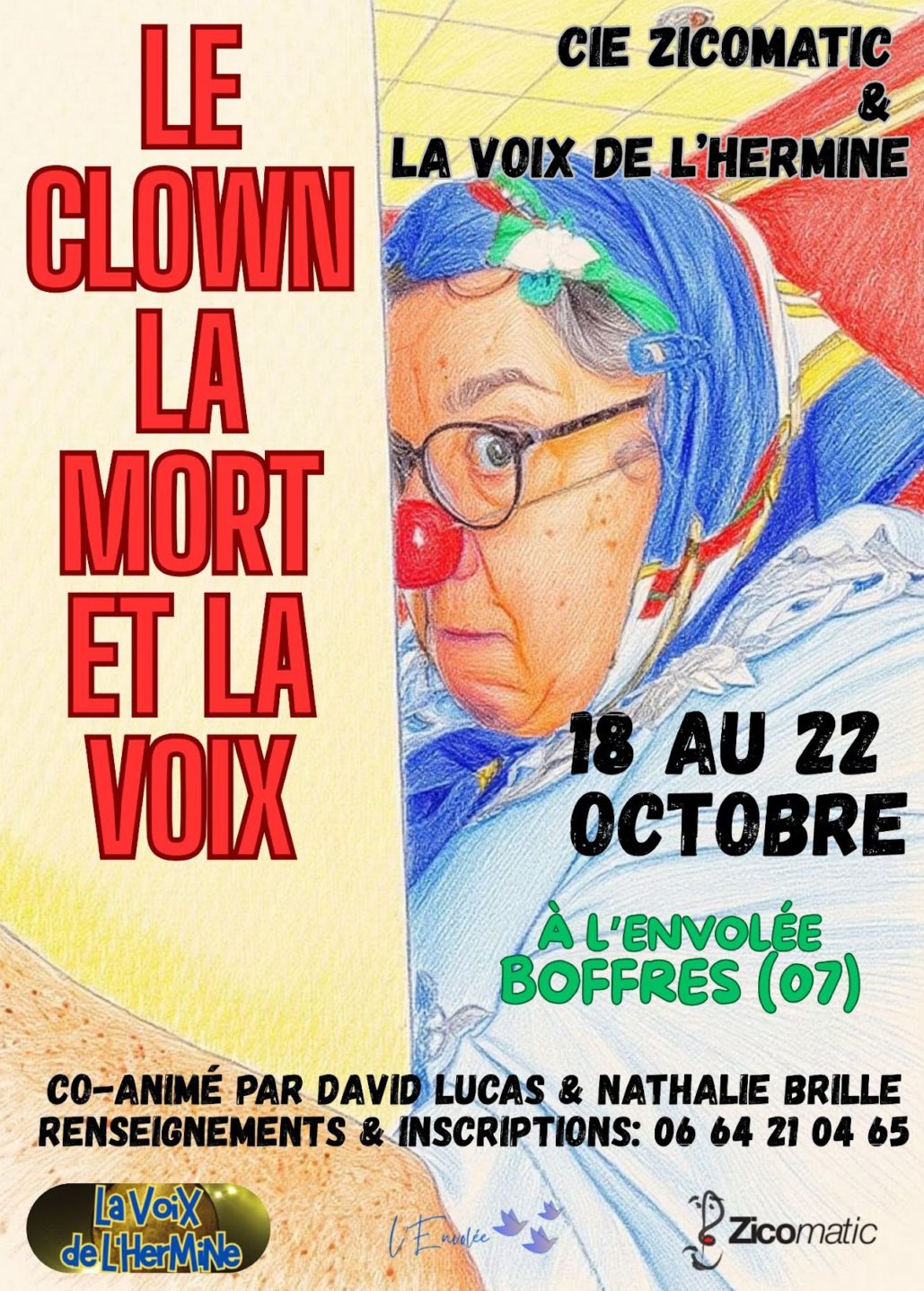 Pour la 2e année, nous ouvrons un stage clown et voix avec pour thème principal, la MORT !!! Nous allons regarder à la loupe le rapport de notre clown à la mort, sa façon de mourir, notre clown a-t-il une vie après la mort ? Ça fait quoi de mourir, de voir la mort approcher? Quels sont mes derniers vœux ?